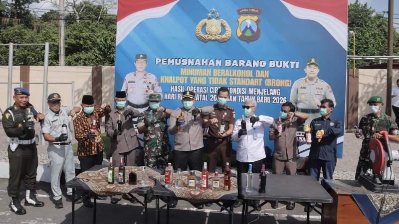 Sebagai bentuk komitmen penegakan hukum, Polres Blitar memusnahkan barang bukti berupa 3.141 botol minuman beralkohol ilegal dan 52 unit knalpot brong. Ribuan botol miras tersebut terdiri dari 2.547 botol arak, 96 botol anggur merah, 176 botol merek TM, 153 botol merek Bintang Kuntul, 82 botol merek Vodka, serta 87 botol merek Iceland.
