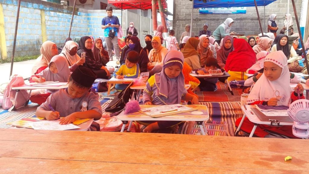 Dengan semangat ramadhan, para peserta yang didampingi orang tua dan guru sekolah masing-masing, mulai berduyun-duyun datang dengan membawa peralatan mewarnai dimulai 7 pagi.