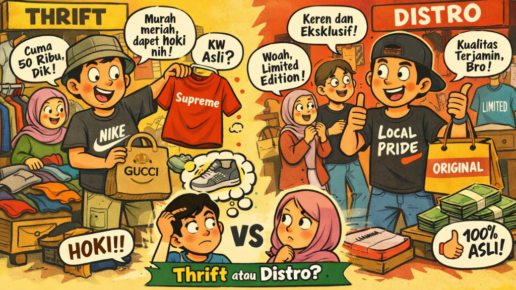 Jika dipikir-pikir, thrift dan distro sebenarnya menawarkan dua pengalaman yang sama-sama menarik. Thrift memberikan sensasi berburu dan kemungkinan mendapatkan brand mahal dengan harga murah. Sementara distro menawarkan kepastian kualitas, desain eksklusif, serta kebanggaan menggunakan produk lokal.